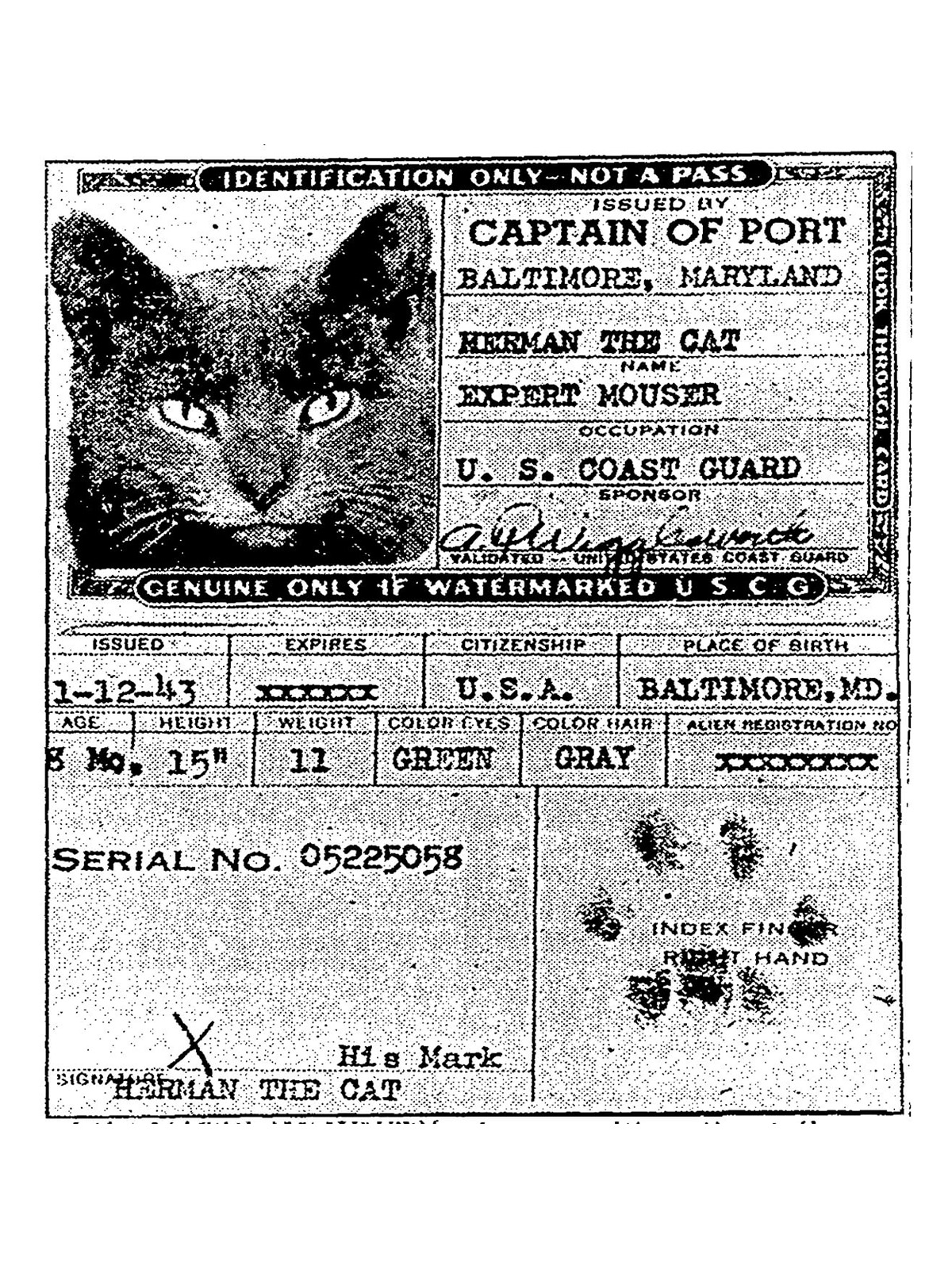 Tarihin en ünlü, en ilginç kedilerinden birisi, resmen donanmaya giren Herman’dır. Gemilerde evcil hayvana izin verildiği zamanlarda Herman’ın fotoğrafı çekilerek kendisine resmi bir kimlik kartı verilmiş, o da fare yakalama mesleğini saklanmadan, rahatlıkla icra etmiştir. ABD’nin Baltimore şehrinde doğan Herman, askeri kimliğinde de görülebildiği üzere donanmaya 12 Ocak 1943 tarihinde katıldı. O tarihte henüz 8 aylıktı. 38 santim boyu ve 5 kilogram ağırlığında olan Herman yeşil gözlere ve gri tüylere sahipti. Kimlik kartını patisiyle imzalamıştı. Herman, hastalık yayan (özellikle de hıyarcıklı veba ve tifüs), halatları kemiren ve yiyecekleri çalan farelere karşı o dönem donanmanın tek umuduydu ve haber bültenlerine konu olmuştu. 4 numaralı rıhtımın şefi A. M. Talbot’a göre Herman bir “iyi niyet elçisi” hatta bir “diplomat”tı. Görev kağıdına fare yakalama dışında insanları eğlendirme görevi de yazılan Herman bu konuda sırt sıvazlamaya izin vermekten ötesine gitmedi. Ancak gerçek bir meselenin çözümünde gösterdiği yararlıkla tarihe geçmeyi becerdi.