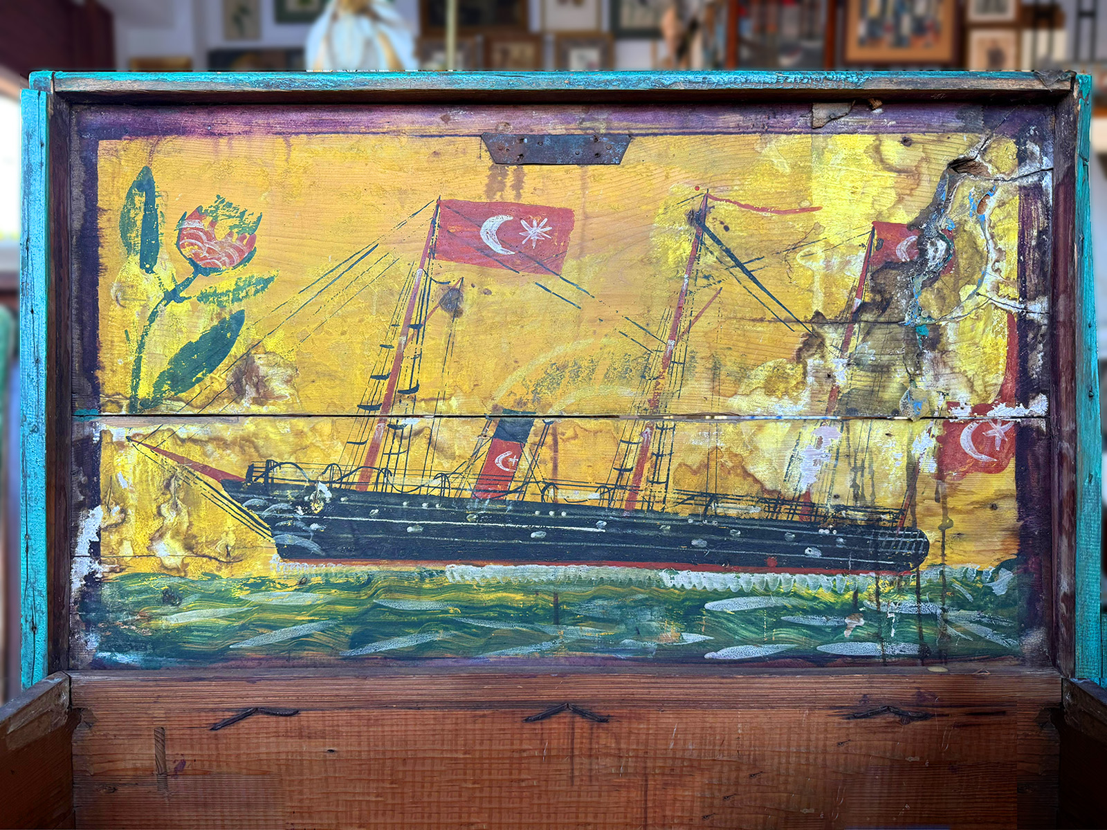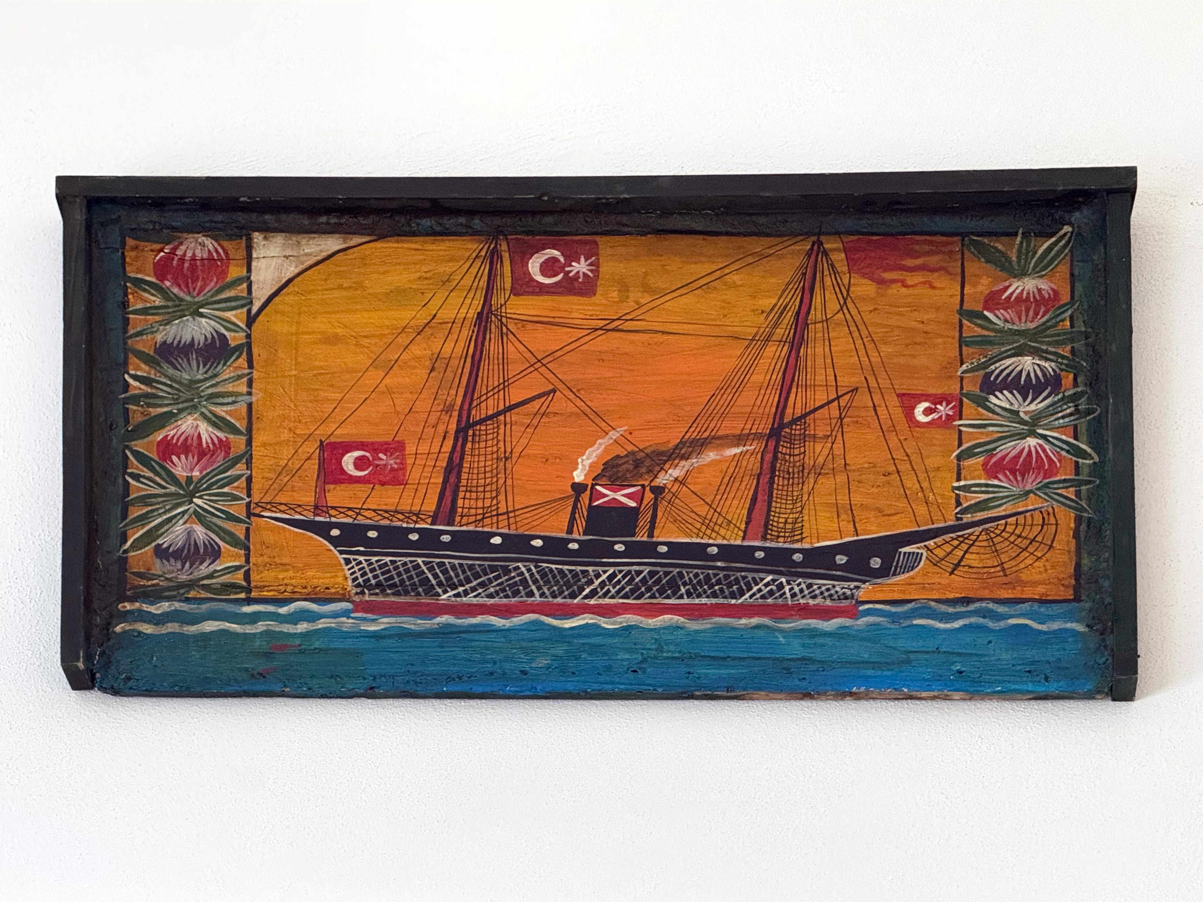 Gemilerdeki Türk bayrağı motifi (özellikle sekiz köşeli yıldızla) sadece milli kimliği ve devlete duyulan sadakati anlatmakla kalmıyor, dönemin politik atmosferinin halk sanatına yansıması olarak da anlam taşıyor. Özellikle mübadele döneminden sonra (1923–1925 arası) Ege kıyılarındaki halk sanatında (Ayvalık, Foça, Urla, Girit göçmenlerinin yerleştiği bölgeler) çeyiz sandıklarında gemi tasvirleri daha sık görülmeye başlıyor. Sandıklar hem bir kayıp hem de bir kurtuluş imgesi olarak öne çıkıyor. Mübadeleyle birlikte Anadolu’ya gelen Rumelili ve Giritli zanaatkârlar, ahşap işçiliği ve sandık yapımına yeni bir üslup getirmişler. Bu ustalar gemiyi bazen Batı üslubunda (yelkenli, liman sahnesi), bazen de naif halk tarzında resmetmişler. Bu nedenle, mübadele sonrasındaki bazı çeyiz sandıkları hem Anadolu geleneksel üslubunu hem de Ege–Rumeli etkilerini taşıyor.