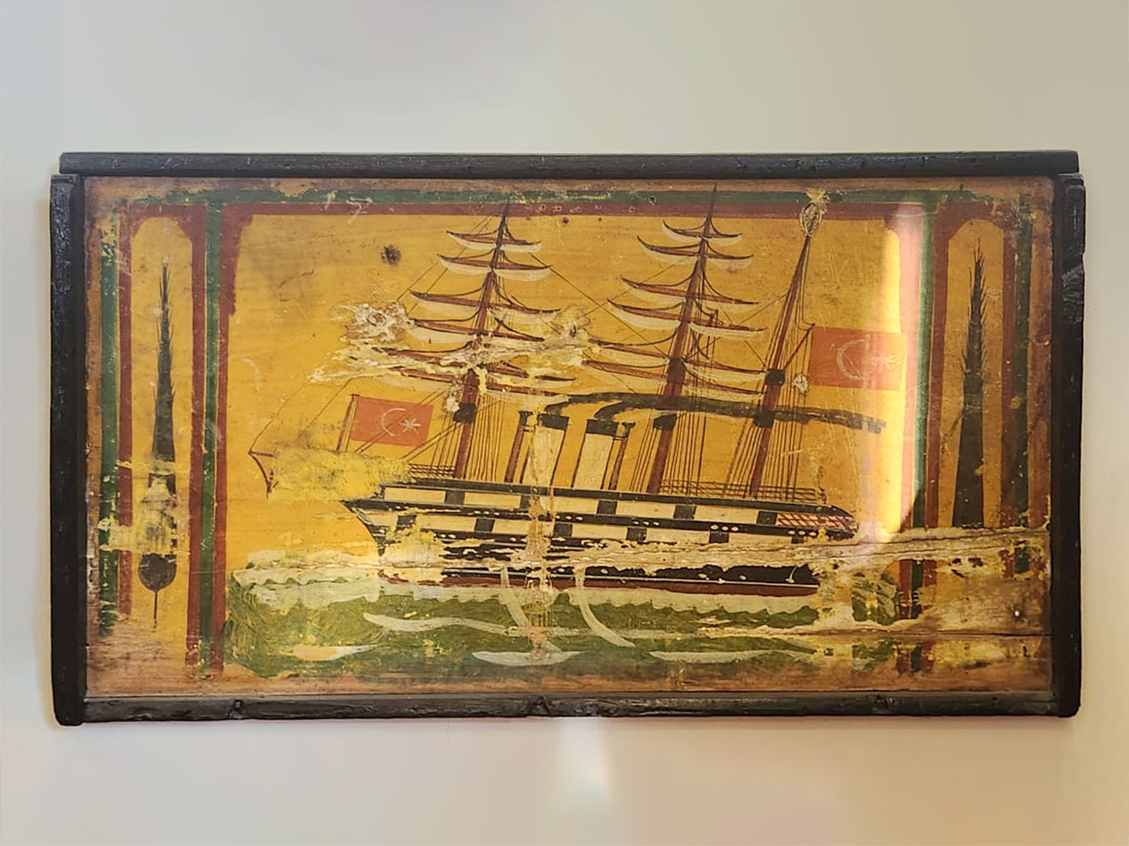 Oyma, kakma, boyama (çoğunlukla sarı ya da turuncu zemin üzerine mavi, yeşil, kırmızı ve altın kökboyası) ya da yakma (pirografi) teknikleri kullanılan tasvirlerde çoğunlukla üç gemi tipine rastlıyoruz: Fırkateyn (Osmanlı’da kullanılan, üç direkli, top taşıyabilen savaş gemileri), korvet (25-32 m uzunluğunda, genellikle deniz ticaret gemilerini korumada kullanılan gemiler) ve monitör (metal gövdeli, görece modern savaş gemileri). Her tasvirde bir Türk bayrağı dalgalanıyor. Nadir de olsa göç ve mübadele döneminin izi olarak Yunan bayrağına rastlanabiliyor. Tasvirlere dikkatle bakınca hemen hepsinin bacasının tüttüğünü yani gemilerin hep hareket halinde olduklarını görüyoruz.